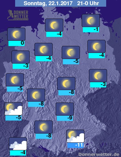 Die Temperaturen am Abend bei Werten um -3 bis +3 Grad C, in der Nacht um 0 bis -11 Grad C.