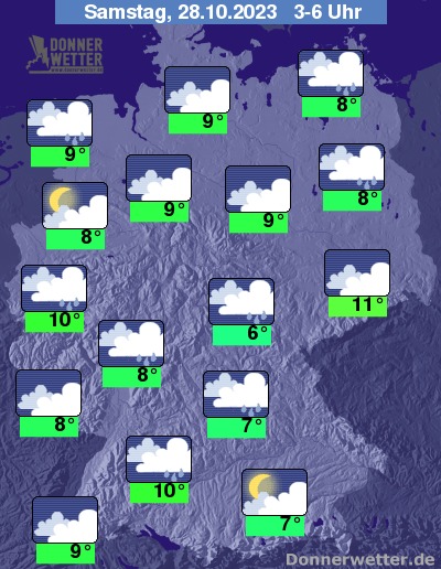 In der Nacht zum Samstag ziehen überwiegend kompakte Wolken durch und es fällt zeitweise Regen. Die Temperatur sinkt auf 11 Grad in Dresden und 6 Grad in Jena.
