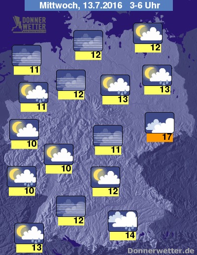 In der folgenden Nacht fällt besonders im Süden und Südosten weiterhin, teils noch ergiebiger und langanhaltender Regen. Weiter nach Norden und Nordwesten sind nur örtlich noch Schauer und Gewitter unterwegs und mehrheitlich bleibt es bei lockerer Bewölkung oder klarem Himmel auch trocken. Die Temperatur sinkt auf 17 Grad in Görlitz und bis 10 Grad im Saargau.