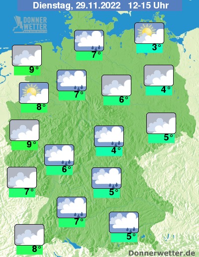 Heute Nachmittag ist es weitgehend bedeckt oder trüb, zum Teil ist es auch neblig. Im Osten, Nordosten und westlich des Rheins bleibt es zumindest weitgehend trocken, während sonst gebietsweise Regen oder Sprühregen fällt. Die Temperatur liegt bei nur 3 Grad in Vorpommern und bis 9 Grad an der Ems.
