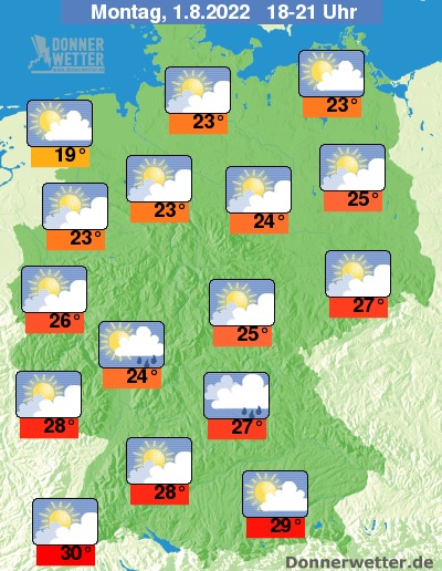Heute Abend heitert es vor allem im Nordwesten, aber auch zum Teil im Norden und Westen immer weiter auf, dazu bleibt es trocken. Im übrigen Land ist es teils stark, teils aufgelockert bewölkt, dazu besteht ein nur ein leichtes Schauerrisiko. Die Temperatur liegt bei 19 Grad in Wilhelmshaven und 30 Grad in Freiburg.