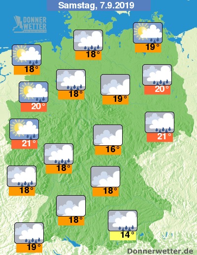 Heute bleibt es über der Südosthälfte des Landes stark bewölkt und besonders südlich des Mains fällt zeitweise Regen. Im übrigen Bundesgebiet ist es zum Teil heiter, häufig ziehen aber auch dichte Wolken durch und es bilden sich einzelne Schauer, selten sind auch Gewitter möglich. Die Temperatur erreicht 14 Grad in München und bis 21 Grad in Bonn.