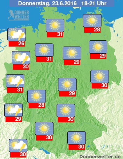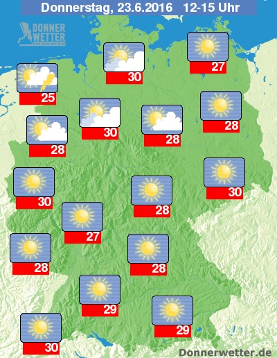 Die Temperatur liegt bei 25 Grad in Emden und um 30 Grad in Bonn.