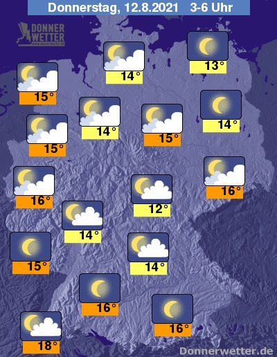 In der folgenden Nacht ist der Himmel vor allem im Süden, Nordosten und Osten häufig sternenklar, sonst ist es meist locker oder aufgelockert bewölkt, dazu bleibt es trocken. Die Temperatur sinkt auf 18 Grad im Breisgau und bis 12 Grad im Vogtland.