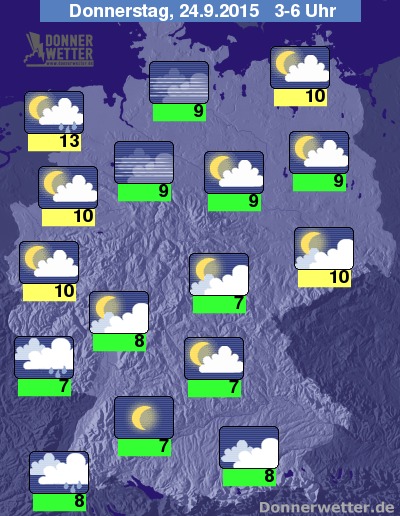 In der Nacht zum Donnerstag halten sich im Alpenvorland und auch im Südwesten des Landes meist dichte Wolken, dabei kann gebietsweise Regen fallen. Im übrigen Bundesgebiet ist es wechselnd bewölkt und mit Ausnahme des Nordseeumfelds, wo sich einzelne Schauer entwickeln können, bleibt es auch trocken. Gebietsweise zeigt sich auch ein sternenklarer Nachthimmel. Die Temperatur sinkt auf 13 Grad an der Nordsee und bis 7 Grad in Franken.