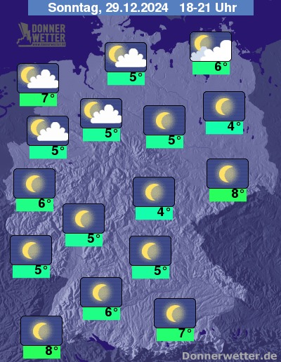 Heute Abend halten sich im Norden hier und da einige Wolken, vor allem in Ostseenähe ist es auch teils stark bewölkt. Im übrigen Land ist der Himmel weitgehend sternenklar. Es bleibt überall trocken bei Werten von 4 Grad im Grabfeld und 8 Grad am Oberrhein.