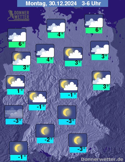 In der Nacht zum Montag zieht es sich im Norden und im Verlauf auch über der Breiten Landesmitte mehr und mehr zu, Regen fällt dabei aber kaum. Weiter nach Süden hin bleibt es meist gering bewölkt oder sternenklar, dazu bleibt es trocken. Die Tiefstwerte liegen bei 6 Grad an den Küsten und rund -3 Grad in Oberbayern.