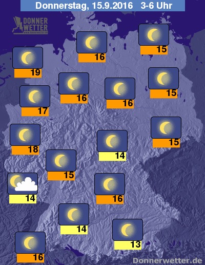 In der Nacht zum Donnerstag ist es zunächst bundesweit sternenklar, in der zweiten Nachthälfte ziehen über den Südwesten und äußeren Süden zeitweise lockere Wolken hinweg, dazu bleibt es trocken. Die Temperatur sinkt auf 19 Grad in Cuxhaven und bis 13 Grad in Passau.