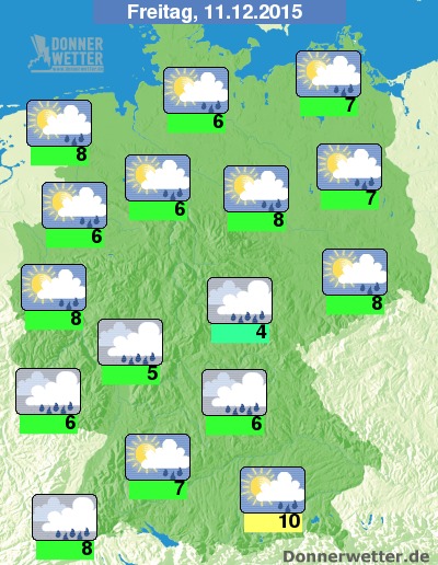 Bereits am Freitag regnet es in weiten Teilen des Landes, vor allem in der Südhälfte ist Sonnenschein zudem Mangelware. Die Temperaturen erreichen im Tagesverlauf Höchstwerte um 4 Grad C im Thüringer Wald und 10 Grad C im Alpenvorland.