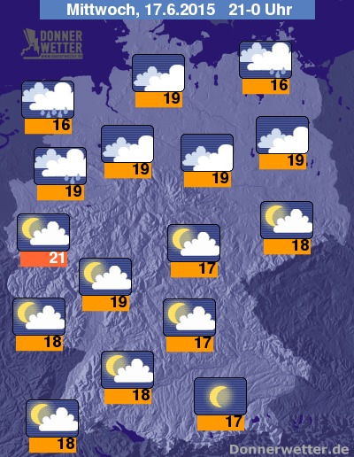 Heute Abend sind die Wolken im Norden bereits weitgehend dicht und es fällt zeitweise Regen. Auch in der breiten Mitte Deutschlands nimmt die Bewölkung langsam weiter zu, dabei ist es hier zunächst trocken, gegen Mitternacht ist jedoch auch hier Regen möglich. Im Süden bleibt es locker bewölkt oder auch sternenklar und trocken. Die Abendtemperatur liegt bei sehr milden 21 Grad in der Kölner Bucht und um 16 Grad auf Rügen.