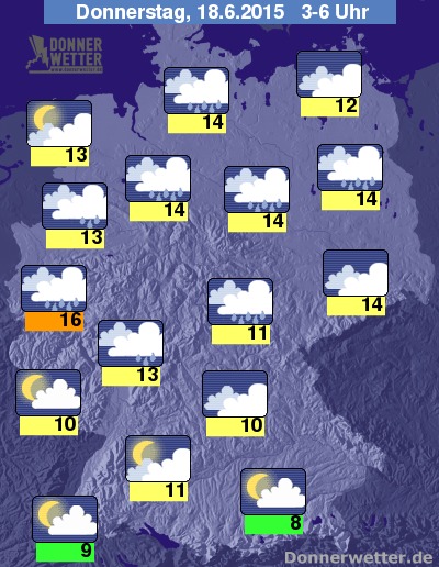 In der Nacht zum Donnerstag bleibt es im Süden bei lockerer bis aufgelockerter Bewölkung weitgehend trocken. In den übrigen Landesteilen ziehen von Norden her jedoch oft dichte Wolken durch und es fällt zeitweise, zum Teil auch kräftiger Regen. Gegen Morgen lockert es von Nordwesten her wieder auf und es bleibt nachfolgend trocken. Die Temperatur sinkt auf 16 Grad im südlichen Rheinland und bis 8 Grad im Chiemgau.