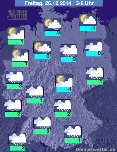 In der folgenden Nacht fällt zeitweise weiterer Schnee, in der Südwesthälfte des Landes auch Schneeregen und teils auch Regen, dazu kann es oft sehr glatt auf den Straßen werden. Meist trocken und auch häufig aufgelockert bewölkt ist es in weiten Teilen Nord- und Nordwestdeutschlands, hier ist nur vereinzelt etwas Schnee möglich. Die Temperatur sinkt auf 3 Grad am Niederrhein und etwa -1 Grad an der Müritz.