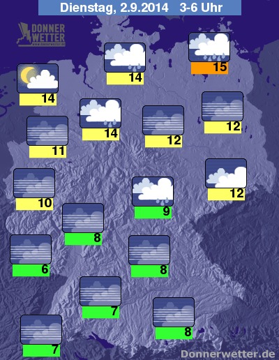 In der laufenden Nacht zieht sich der Himmel über dem Norden und Osten vielfach zu und es fällt gebietsweise Regen, während es weiter nach Südwesten hin vielfach nur locker bewölkt oder auch sternenklar und dabei trocken bleibt. Stellenweise kann sich jedoch Nebel bilden. Die Temperatur sinkt auf 15 Grad in Neubrandenburg und auf herbstlich frische 6 Grad in der Südeifel.