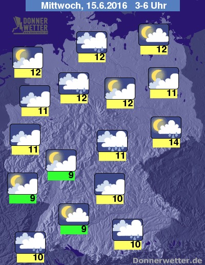 In der bevorstehenden Nacht klingen die Niederschläge über dem Bundesgebiet größtenteils ab. Oft dicht bewölkt bei zeitweiligen Regenfällen bleibt es indes über dem Süden des Landes, sowie über Thüringen und Sachsen. Über den Norden ziehen ebenfalls teils dichte Wolken und es fällt gebietsweise Regen. Im übrigen Land bleibt es im Nachtverlauf bei überwiegend aufgelockerter, teils starker Bewölkung meist trocken. Die Temperatur sinkt auf 14 Grad in Dresden und 9 Grad im Bliesgau.