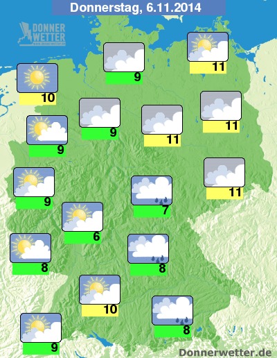 Am Donnerstag halten sich im Osten und Süden noch verbreitet dichte Wolken und es fällt hier und da auch Regen, sonst kann sich aber auch wieder vermehrt die Sonne zeigen, gebietsweise wird es im Westen und Nordwesten auch heiter, dazu bleibt es trocken. Die Temperatur steigt auf 6 Grad am Odenwald und auf rund 11 Grad in der Lausitz.