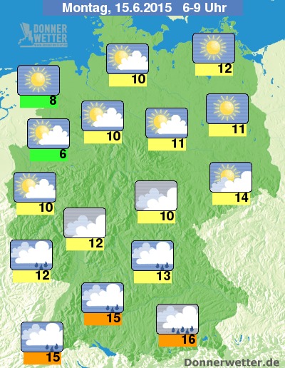 Der Montagmorgen startet ähnlich. Im Norden heiter bis wolkig oder sonnig, im Süden dicht bewölkt und regnerisch.