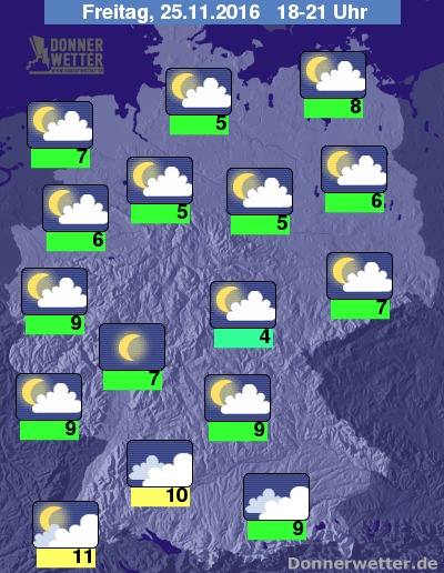 Heute Abend bleibt es im Alpenvorland überwiegend bedeckt, dazu jedoch trocken. Weiter nördlich anschließend ziehen dagegen meist lockere Wolkenfelder durch und über der breiten Landesmitte ist es auch teils sternenklar. Die Temperatur liegt bei 4 Grad im Thüringer Becken und 11 Grad im Breisgau.