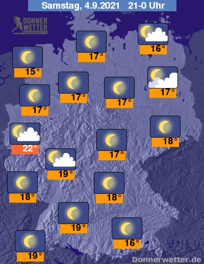 Die Temperaturen gehen bis Mitternacht auf Werte um 22 Grad im Rheinland und 15 Grad an der Nordseeküste zurück.