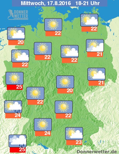 Heute Abend bleibt es im Land verbreitet heiter oder sonnig und trocken. Einige Quellwolken ziehen jedoch hier und da über den Südwesten und das Alpenvorland hinweg, dabei können sich einzelne Schauer oder Gewitter entwickeln. Die Abendtemperatur liegt bei 20 Grad im Vogtland und um 25 Grad in Freiburg.