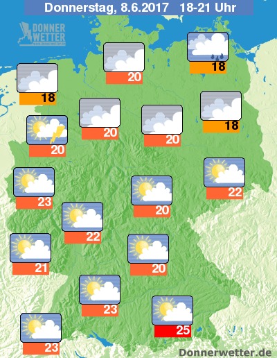Die Höchstwerte liegen am frühen Abend zwischen kühlen 18 Grad an den Küsten und warmen 25 Grad und mehr am Alpenrand.