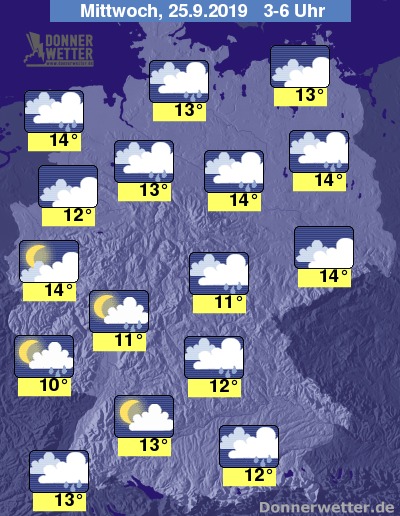 Während der zweiten Nachthälfte kommt der Regen auch weiter in den Norden und Nordosten voran. Von Frankreich und Belgien her lockert die Wolkendecke zeitweise etwas auf und lässt einige Sterne erkennen.