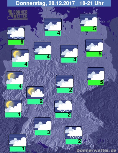 Bis zum Abend lassen die Schneefälle auch im Süden mehr und mehr nach, nur im östlichen Bayern fallen dann vereinzelt noch ein paar Flocken. Im direkten Nordseeumfeld regnet es hingegen vereinzelt. Sonst ist der Himmel im restlichen Land meist dicht bewölkt, Aufhellungen gibt es noch am ehesten entlang des Rheins.
