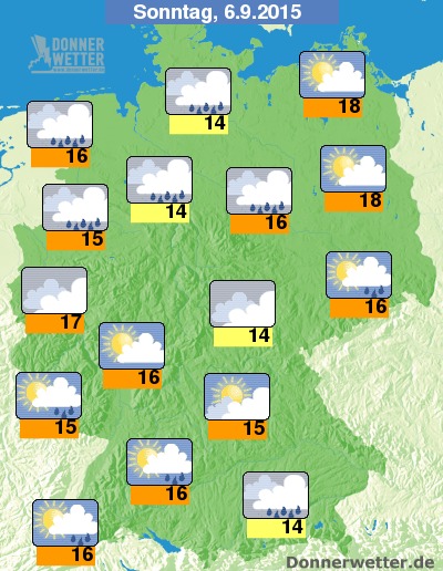 Am Sonntag ist es ebenfalls oft stark bewölkt und es bilden sich besonders über der Nordhälfte Deutschlands Schauer und auch mögliche Gewitter. Nach Süden hin werden die Wolken insgesamt weniger, so dass die Sonne häufiger zum Vorschein kommt, aber auch hier können sich einzelne Schauer entwickeln. Es werden nur 13 bis 18 Grad erreicht.