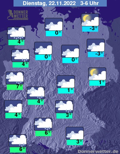 Am Dienstag bleibt es verbreitet trüb oder bedeckt, stellenweise auch neblig-trüb. Es fällt gebietsweise etwas Regen, Schneeregen oder Schnee. Vom Mittel-, zum Niederrhein und zur Nordsee zeigen sich gebietsweise Aufheiterungen. Die Temperatur erreicht 3 Grad in Neubrandenburg und bis 8 Grad in Bonn.