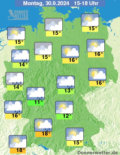 Am Montagnachmittag zeigt sich der Himmel über dem Osten und Nordosten heiter bis wolkig oder aufgelockert bewölkt und es bleibt trocken. In den übrigen Landesteilen überwiegt stärkere Bewölkung, dabei muss von Westen und Südwesten mit nach Nordost ausgreifendem Regen gerechnet werden, im Westen kann es am Nachmittag auch mal stärker und anhaltender regnen.