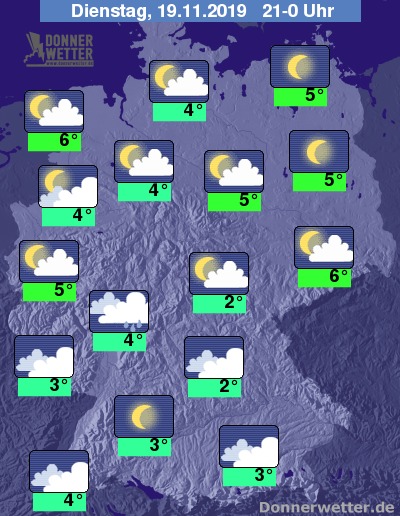 Während der zweiten Nachthälfte präsentiert sich der Himmel teils wolkenverhangen, teils aufgeklart, Niederschlag fällt kaum. Stellenweise bildet sich Nebel.