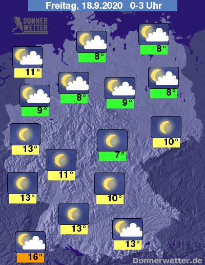Tiefstwerte in der Nacht meist um 12 bis 6 Grad, am Oberrhein milder.
