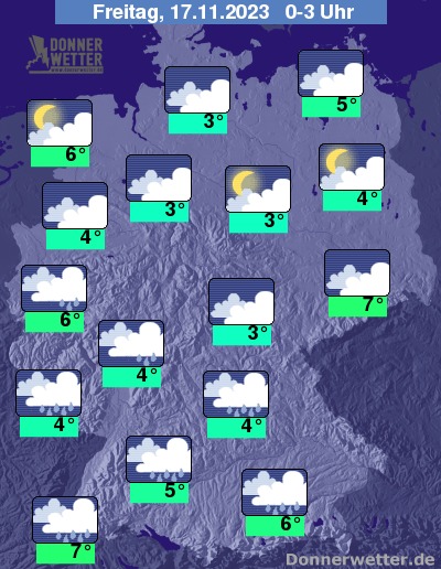 In der Nacht fällt südlich der Eifel und des Mains Regen, im südlichen Bayern und Baden-Württemberg auch anhaltend. Die Schneefallgrenze sinkt in der zweiten Nachthälfte auf 600 bis 800 m. Vorsicht, lokale Glättegefahr! Im äußersten Süden und Südwesten ist zudem mit Sturmböen oder sogar vereinzelten schweren Sturmböen zu rechen. In der Nordhälfte bleibt es bei wechselnder bis starker Bewölkung meist trocken.
