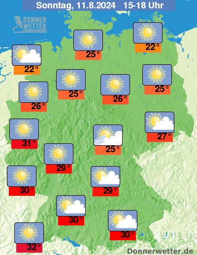 Die Temperaturen erreichen im Tagesverlauf Höchstwerte um 22 Grad an den Küsten und 32 Grad am Oberrhein.