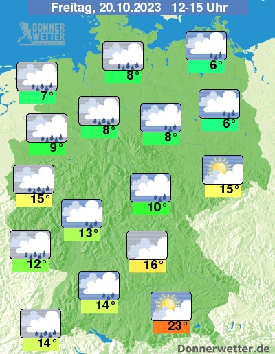 Heute Nachmittag ist der Himmel über der ganzen Bundesrepublik bedeckt und es fällt verbreitet, teilweise auch langanhaltend Regen. Lediglich über Bayern und Sachsen ist es auch oft trocken. Die Temperatur liegt bei nasskalten 6 Grad an der Müritz und bis zu warmen 23 Grad im Raum München. Im Norden weht ein oft stürmischer Wind. An den Küsten von Nord- und Ostsee herrscht teils schwerer Sturm.