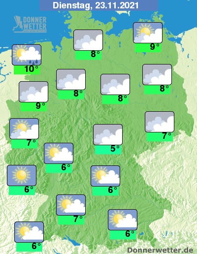 Am Dienstag zeigt sich das Wetter im Süden oft heiter bis sonnig, teils aber auch neblig. Im übrigen Bundesgebiet ist es meist stark bis dicht bewölkt, dabei bleibt es weitgehend trocken. Die Temperatur steigt auf 5 Grad in Erfurt und bis 10 Grad in Bremerhaven.