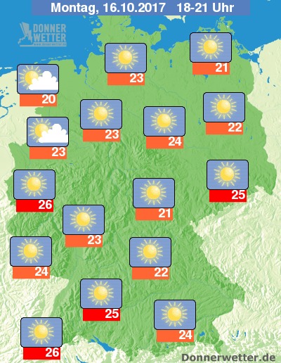 Am Dienstag ist es verbreitet heiter oder sonnig, gebietsweise können auch mal einige Wolken durchziehen, dabei bleibt es trocken. Die Temperatur steigt auf 17 Grad an der Nordseeküste und bis 25 Grad in Dresden.