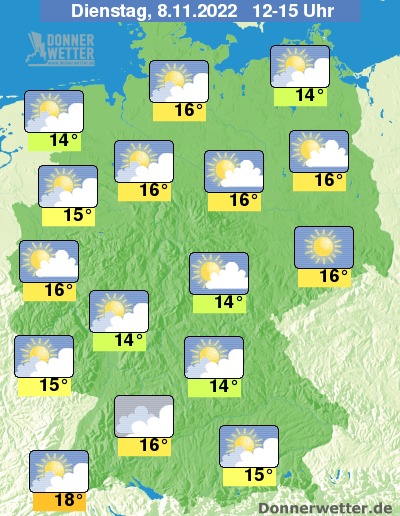 Heute Nachmittag ist es teilweise trüb oder stark bewölkt, häufig zeigen sich jedoch Aufheiterungen, dabei bleibt es trocken. Die Temperatur liegt bei 14 Grad in Vorpommern und bis 18 Grad im Breisgau. An der Nordsee ist es verbreitet stürmisch.
