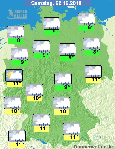 Heute ist es verbreitet stark bewölkt, dabei fällt gebietsweise Regen, hier und da sind kurze Auflockerungen möglich. Die Temperatur erreicht milde 6 bis 11 Grad.