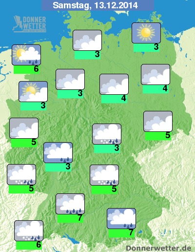 Am Samstag halten sich dabei meist dichte Wolken, wobei sich Regen und Schneeregen im Tagesverlauf in die Südosthälfte Deutschlands zurückziehen, sonst bleibt es ab dem Nachmittag meist trocken und im Norden und Nordwesten kann sich auch mal die Sonne zeigen. Es werden kühle 3 bis 7 Grad erreicht.