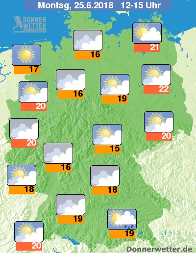 Die Temperaturen erreichen Werte um 15 Grad C im Thüringer Wald und um 22 Grad C in Berlin.