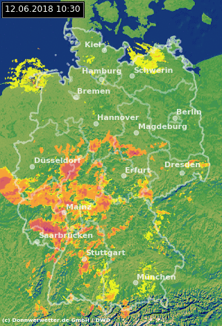Schauergebiete ziehen aktuell vor allem über den Südwesten und die mittleren Landesteile hinweg. Sehr nass werden die kommenden Stunden vor allem in Teilen von Rheinland-Pfalz sowie in Hessen und später Thüringen.