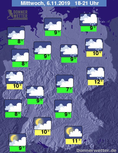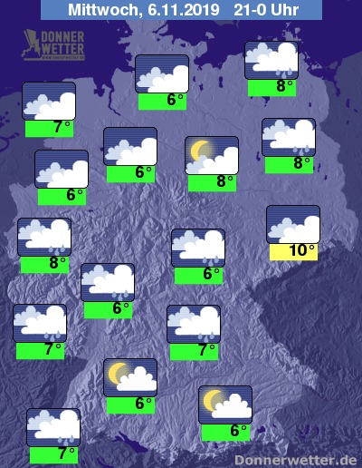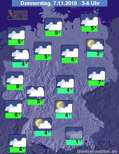 Bis zu den Frühstunden kühlt die Luft auf Werte zwischen 1 und 8 Grad ab, vielleicht kann es im Süden auch mal zu leichtem Frost und Reif kommen, am mildesten bleibt es in den Ballungsgebieten des Westens.