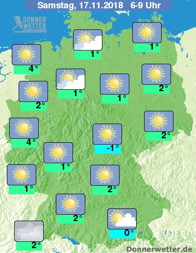 Die Temperaturen erreichen am Morgen Werte um -1 Grad C in den Höhenlagen der Mittelgebirge und um 4 Grad C in Emden.