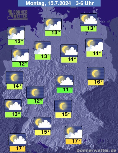 In der Nacht zum Montag zeigt sich der Himmel meist wechselnd oder gering bewölkt und es bleibt meist trocken. Ein geringes Schauerrisiko besteht im Alpenvorland.