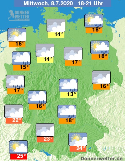 Die Temperaturen liegen am frühen Abend meist zwischen kühlen 13 und 19 Grad, lediglich ganz im Süden und Südwesten bleibt es mit Werten zwischen 20 und 25 Grad oder mehr angenehm warm und teilweise sommerlich.