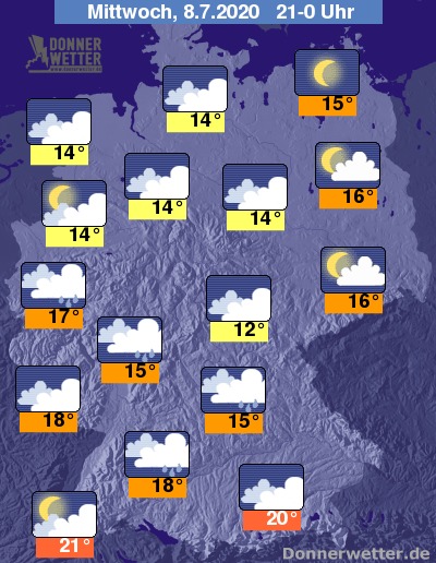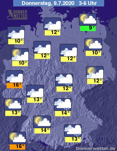 Bis zu den Frühstunden kühlt die Luft auf 8 bis 16 Grad ab, am kühlsten wird es in den Bereichen, in denen die Sterne am längsten leuchten, am mildesten bleibt es im Breisgau, sowie in den größeren Städten Westdeutschlands.