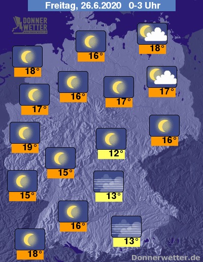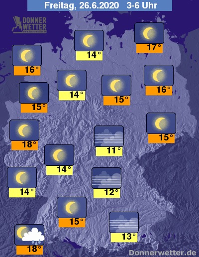 Während der zweiten Nachthälfte bleibt es oft sternenklar. Stellenweise können sich einige Nebelbänke bilden. Am Oberrhein werden die Wolken gegen Morgen wieder dichter und können es örtlich tröpfeln lassen.