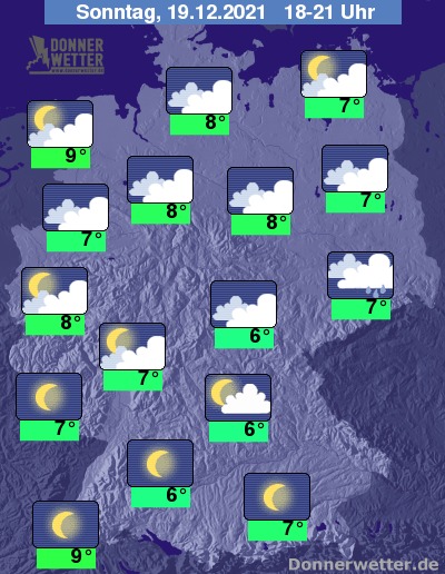 In der Nacht zum Montag klart der Himmel zunächst im Norden, im weiteren Verlauf über der Nordhälfte des Landes auf. Weiter nach Süden hin bleibt es bis zum Morgen zumeist stark bewölkt, hier und da und vor allem am Alpenrand lockert der Himmel auf. Es bleibt landesweit trocken. Die Temperatur sinkt auf 6 Grad in Köln und etwa 0 Grad in Hamburg.