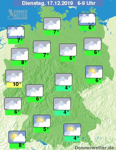 Im weiteren Verlauf nimmt die Bewölkung dann auch in den mittleren Landesteilen wieder zu, nur südlich der Donau sowie über Brandenburg und Sachen dominiert lockere oder aufgelockerte Bewölkung. An den Küsten kann in den frühen Morgenstunden etwas Regen fallen, sonst bleibt es meist trocken.