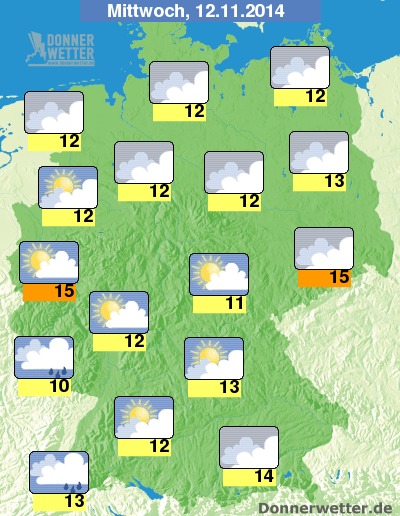 Am Mittwoch ist es teils aufgelockert, besonders im Norden, Osten, Südosten und auch im Südwesten ist es aber meist stark bewölkt, dabei kommt am Nachmittag und Abend im Südwesten und im äußeren Westen Regen auf, sonst bleibt es weitgehend trocken. Die Temperatur steigt auf 11 bis 15 Grad.